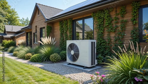 Modern Residential Heat Pump Unit Outside Eco Friendly House with Green Plants Providing Sustainable Renewable Energy and Efficient Climate Control