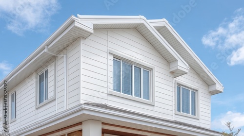 Modern Residential House Exterior with White Siding, Large Windows, and Blue Sky in Background, Showcasing Contemporary Architectural Design Features