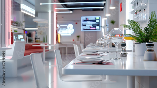 Modern restaurant interior featuring sleek white furniture, elegant table settings, and vibrant neon lighting, creating lively atmosphere