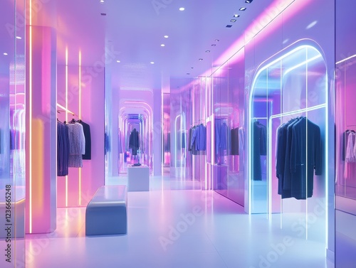 Modern Retail Space with Neon Lights and Stylish Clothing Displays