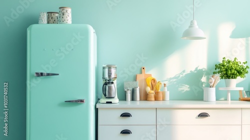 Modern Retro Kitchen with Mint Green Refrigerator and Accessories