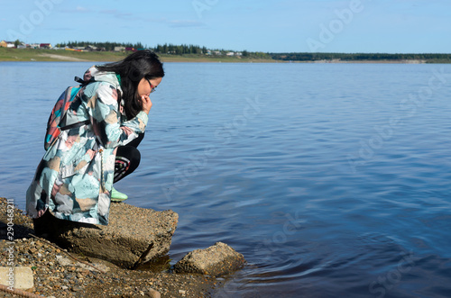 Modern sad girl Yakut looks at the water of the river Viluy near the village of ulus Suntar contaminated with waste from the diamond producer in the North of Russia in Yakutia.