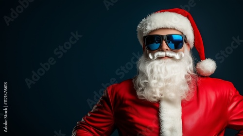 Modern Santa Claus in sunglasses against a dark background, with copy space.