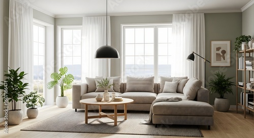 Modern Scandinavian Living Room Interior with Natural Light and Indoor Plants