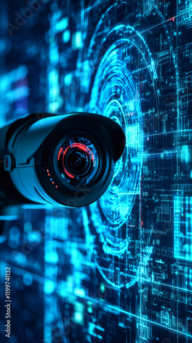 Modern security camera analyzing data on a futuristic holographic interface, ensuring robust surveillance and data protection