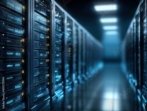 Modern server room with blue-lit racks, showcasing a complex network infrastructure in a well-lit, controlled environment - AI-Generated