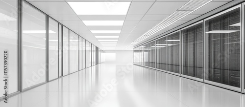 Modern server room with sleek glass walls and empty space for text showcasing advanced technology and spacious design