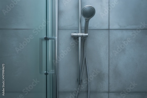 Modern shower head and glass door in a contemporary bathroom high angle shot for interior design and home improvement projects