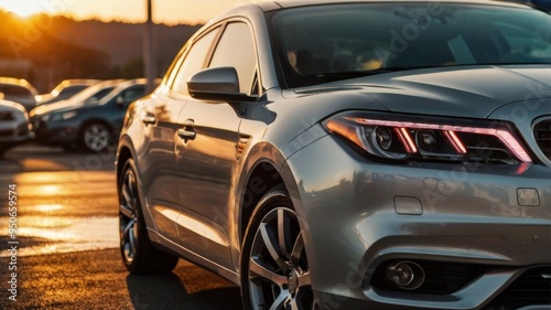 Modern silver car parked at dealership during sunset