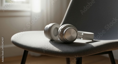 Modern silver wireless headphones lie on a gray fabric chair in a minimalist interior with sunlight coming in from the window
