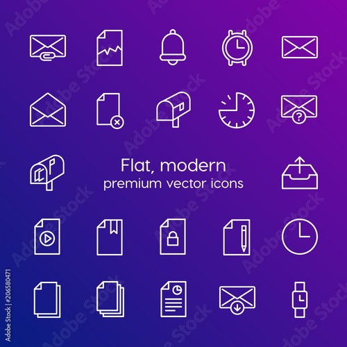 Modern Simple Set of folder, time, files, email Vector outline Icons. Contains such Icons as file, fashion, hand, download, message and more on gradient background. Fully Editable. Pixel Perfect