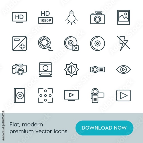 Modern Simple Set of video, photos Vector outline Icons. ..Contains such Icons as photography, background, iso, hd, image, lamp, media and more on white background. Fully Editable. Pixel Perfect.