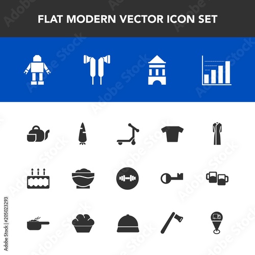 Modern, simple vector icon set with cake, equipment, map, machine, location, construction, food, gym, audio, sweet, chef, transport, coffee, drink, vegetable, music, axe, tower, shirt, scooter icons