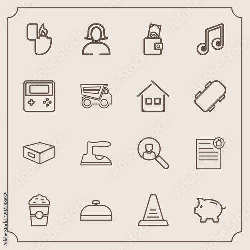 Modern, simple vector icon set with estate, girl, cup, contract, ladder, drink, domestic, real, internet, money, woman, flame, trip, ironing, bag, lady, computer, luggage, lighter, housework, up icons