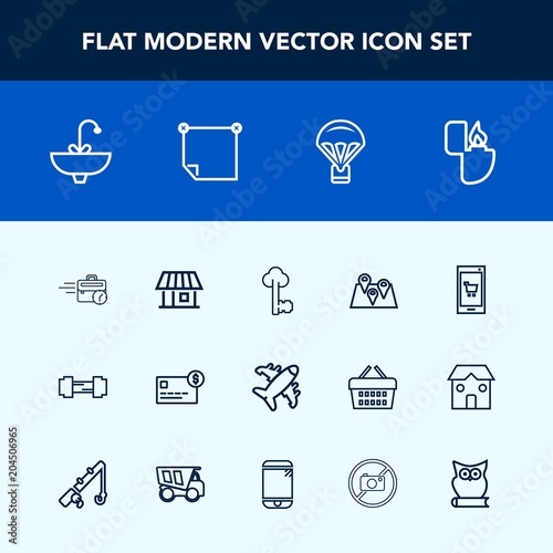 Modern, simple vector icon set with exercise, travel, bank, airplane, aircraft, money, gym, location, credit, app, balance, bathroom, flight, tap, object, office, faucet, vintage, plane, sport icons