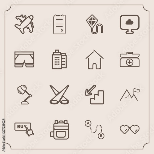 Modern, simple vector icon set with modern, map, airplane, element, buy, destination, fashion, rucksack, money, web, light, up, background, down, aircraft, glasses, nature, backpack, backdrop icons