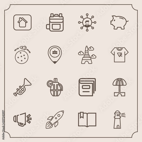 Modern, simple vector icon set with open, military, book, space, grenade, communication, sun, bugle, shuttle, backpack, launch, technology, trumpet, jazz, water, sea, loudspeaker, umbrella, home icons