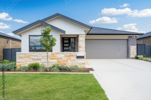 Modern single-story house with elegant design and landscaped front yard set against a clear blue sky in a quiet residential neighborhood