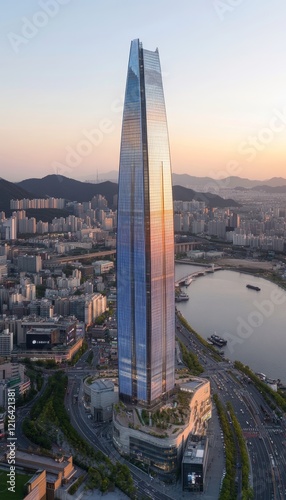 Modern Skyscraper Dominating the Cityscape, Golden Sunset Reflected in Glass Facade.