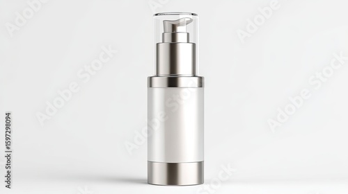 Modern, sleek, cylindrical cosmetic bottle, featuring a pump dispenser, isolated on a plain background.