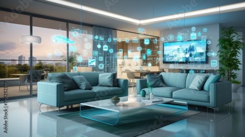 Modern Smart living room Ecosystem interior with technology maintaining connections