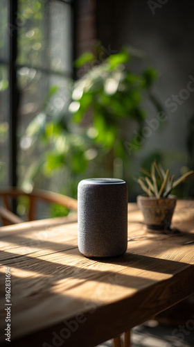 Modern Smart Speaker Standing on Wood Table in Sunlit Living Room