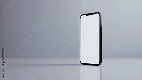 Modern smartphone with blank white screen on a reflective gray surface background