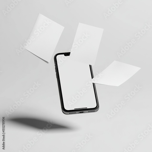 Modern smartphone with floating blank pages against minimalistic gray background