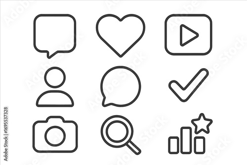 Modern social media icons set with popular symbols, simple line art style, vector cartoon illustration, transparent background, ordered collection of essential digital communication signs