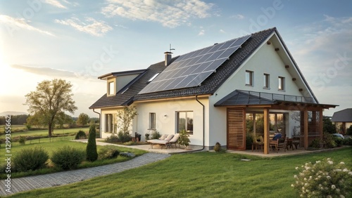 Modern Solar House Evening Light Composition, Sustainable Home Design, Photovoltaic Panels Sustainable Energy, Eco House
