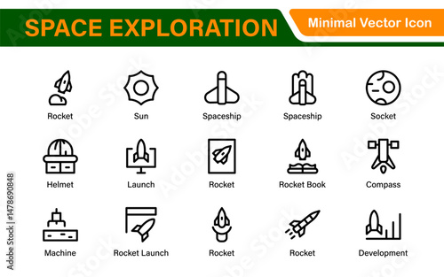 Modern Space Exploration Technology Icons – Outline, Line Art, Vector Illustrations for Rocket Science, Satellites, Astronauts, and Future Missions