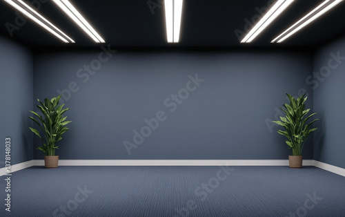modern, spacious room with dark blue walls, bright ceiling lights, and two potted plants, creating serene atmosphere