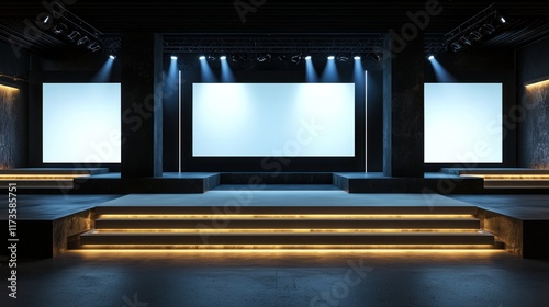 Modern Stage Design: Dark Concrete, Illuminated Steps, Blank Screens