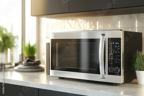 Modern stainless steel microwave on kitchen counter