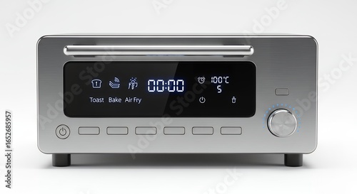 Modern Stainless Steel Toaster Oven and Air Fryer Appliance with Digital Display and Controls