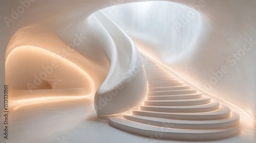 Modern staircase with light, curved walls lead to an opening. For dreamy, surreal architecture or aspirational design projects.