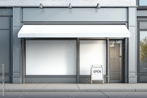 Modern storefront facade with a minimalist design featuring a prominent open sign inviting customers in