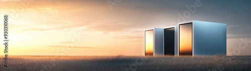 Modern structure under a vibrant sunset, showcasing architectural innovation against a serene landscape.