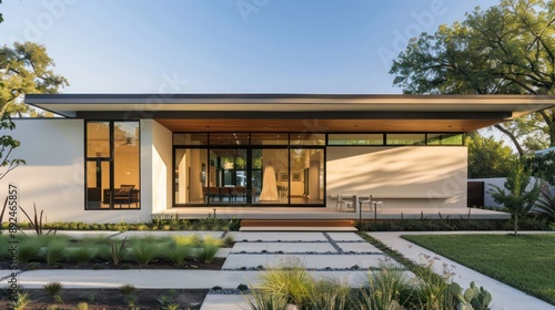 Modern suburban home featuring clean lines, a flat roof, and an expansive front porch with minimalist landscaping