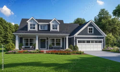 Modern suburban house with a stunning facade, inviting front porch, well-maintained lawn, blooming flowers, and spacious driveway under a clear blue sky, perfect for family living