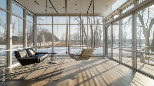 modern sunroom in a suburban home, featuring floor-to-ceiling glass walls and a suspended swing chair