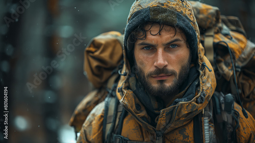 Modern survivalist with backpack and necessary survival equipment