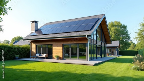 Modern sustainable house with solar panels on roof surrounded by lush green lawn High resolution image capturing ecofriendly living concept