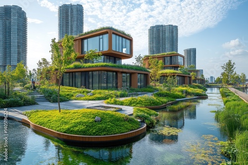 Modern sustainable housing complex with water features