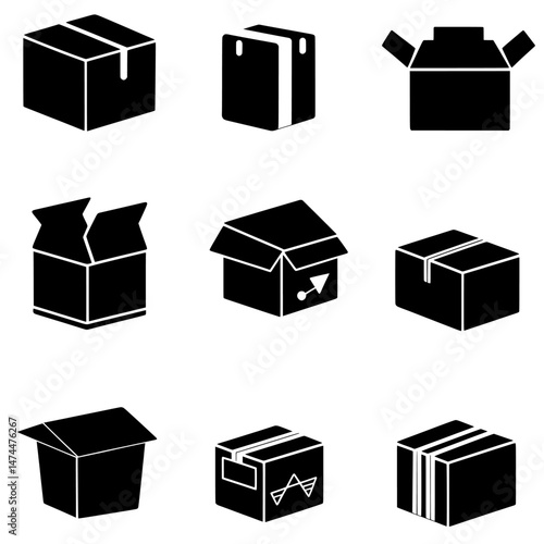 Modern symbols for packaging include isolated black silhouette icons of open and closed boxes