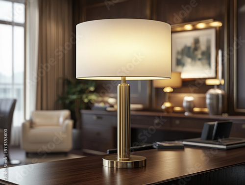 modern table lamp with a matte brass finish and a large, off-white drum shade, set on a dark oak desk in a sophisticated office setting