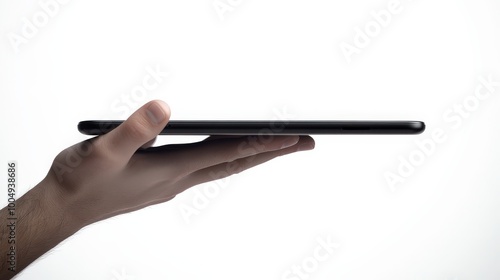 Modern Technology in Hand: Elegant Black Tablet Held with Precision against White Background