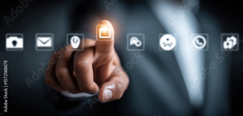 Modern technology interface with a person pressing a glowing security or lock icon on digital screen with various app icons and a futuristic background