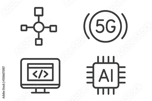 Modern Technology Line Icons Set. Information Technology Vector. Networking System, 5G Wireless, Communication Hub, AI Microchip, Computer Coding, Web Design, Digital Devices, Connection Concept