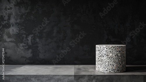 Modern terrazzo podium on dark concrete background with dramatic side lighting for product display